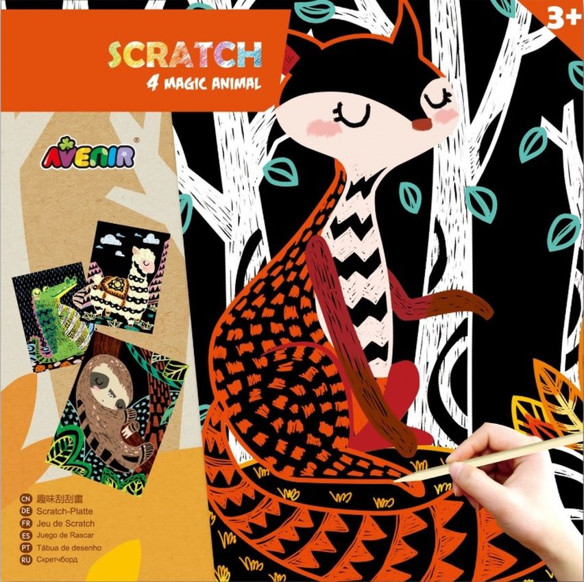Avenir Scratch to zupełnie nowe podejście do prac ręcznych. Wyjątkowy arkusz, na którym tworzy się poprzez zdrapywanie warstwy wierzchniej, by odsłonić wielobarwną warstwę spodnią. Zabawka kreatywna najwyższych lotów, pozwalająca nie tylko tworzyć piękne prace, ale także dająca doświadczenia sensoryczne - dzięki użyciu odpowiedniego narzędzia i zachowywania się papieru podczas zabawy dziecko odbiera nowe wrażenia dotykowe. W zestawie są 4 magicne zwierzęta oraz patyczek do zdrapywania. Dla dzieci powyżej 3. roku życia. Opakowanie: 23 x 23 cm.