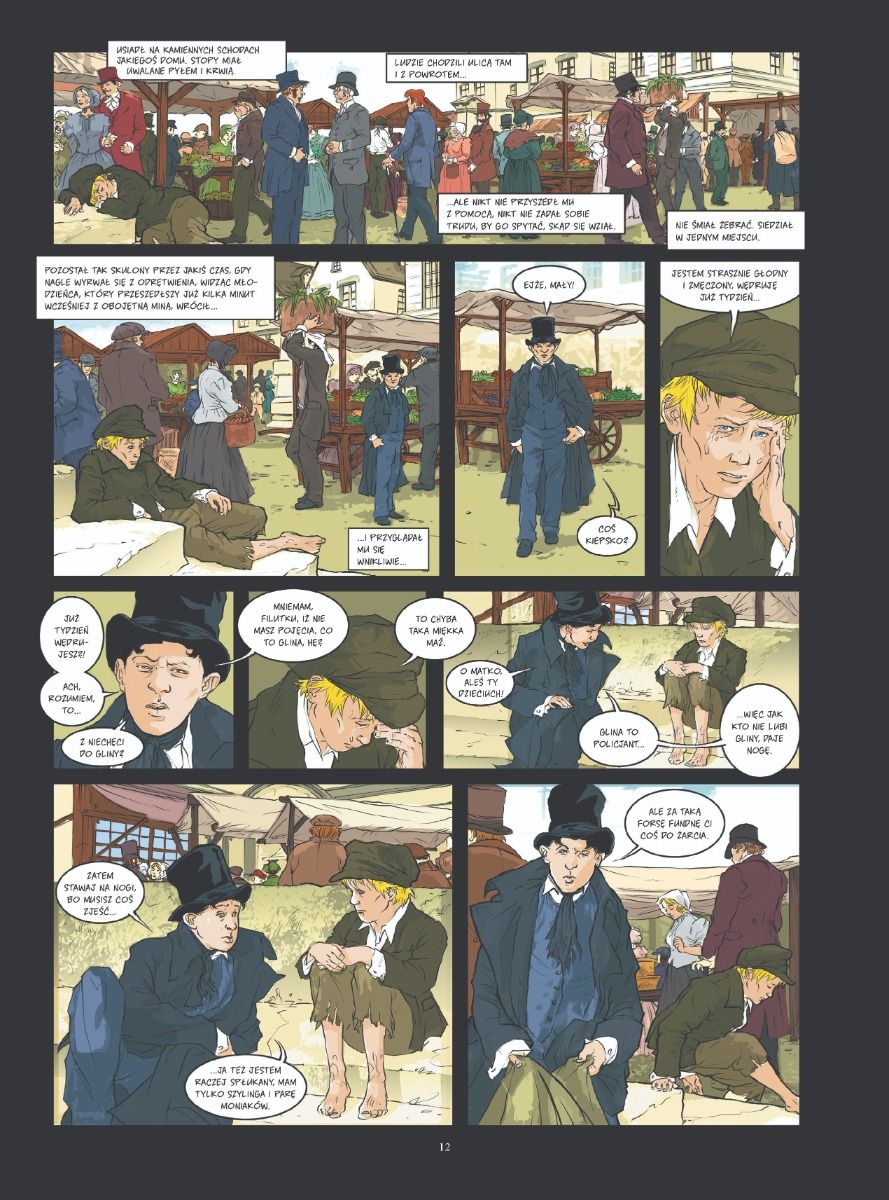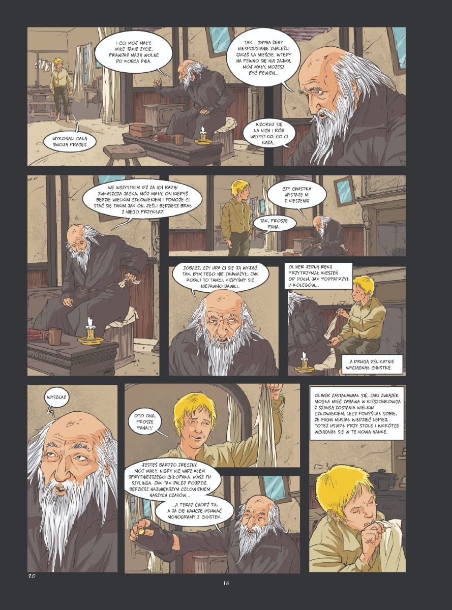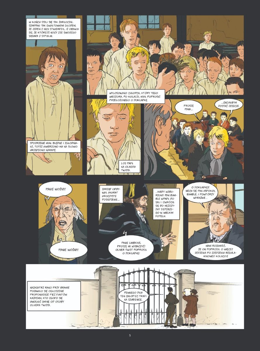 Komiksowa adaptacja jednej z najbardziej znanych powieści obyczajowych angielskiego pisarza Charlesa Dickensa, jednego z najwybitniejszych przedstawicieli nurtu powieści społeczno-obyczajowych w drugiej połowie XIX wieku. Po śmierci matki Oliver Twist przebywa w sierocińcu, z którego zostaje wygnany za to, że ośmielił się poprosić o dokładkę owsianki. Zostaje czeladnikiem grabarza, ale ten ustawicznie go dręczy, więc Oliver postanawia uciec. Dociera do Londynu, gdzie zostaje wciągnięty do bandy młodych złodziejaszków pracujących dla starego Fagina. Poznaje ich okrutny świat, w którym liczy się jedynie spryt. Przez przypadek zostaje oskarżony o kradzież i złapany przez policję, a członkowie szajki obawiają się, że może ich wydać i chcą go uciszyć. Na szczęście spotyka na swojej drodze dobrych ludzi, dzięki czemu jego życie może ulec zmianie.