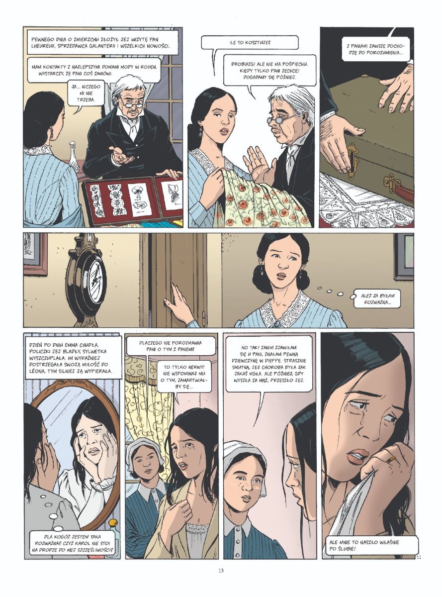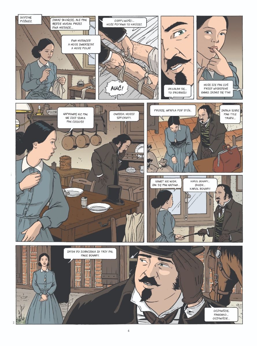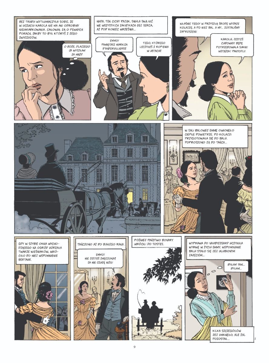 Komiksowa adaptacja powieści jednego z największych mistrzów literatury francuskiej XIX wieku – Gustaveʼa Flauberta. Francja, czasy panowania Ludwika Filipa. Córka rolnika, piękna Emma, wychodzi za mąż za starszego od siebie Karola Bovary’ego, nieśmiałego prowincjonalnego lekarza, wiodącego proste i skromne życie. Podczas balu u lokalnego dostojnika Emma odkrywa wspaniałości dobrego towarzystwa i stopniowo oddala się od zwyczajnej poczciwości męża. Chroni się w marzeniach i niczym kokietka pozwala się uwodzić, mnoży długi i kochanków, nie znajdując jednak szczęścia. Ostatecznie, zagubiona i zrujnowana, nieskutecznie szuka sposobu, aby uciec od wstydu zmarnowanego życia.