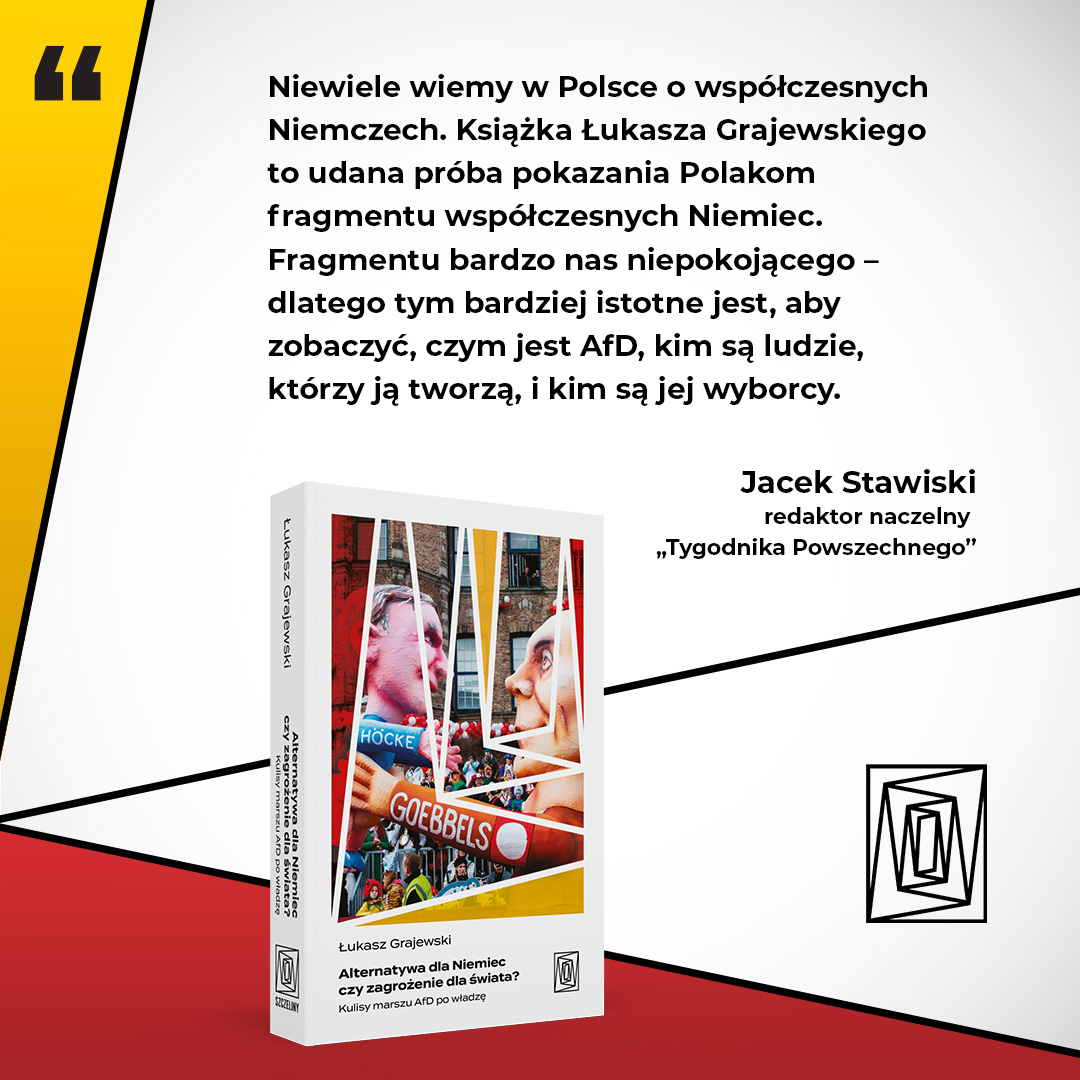 Łukasz Grajewski, dziennikarz mieszkający w Niemczech, od początku śledzi rozwój AfD: rozmawiał z jej politykami, działaczami i wyborcami, a także z ich przeciwnikami. Z jego reportażu wyłania się obraz kraju, w którym demokratyczny system zbudowany po II wojnie światowej chyli się ku upadkowi.
