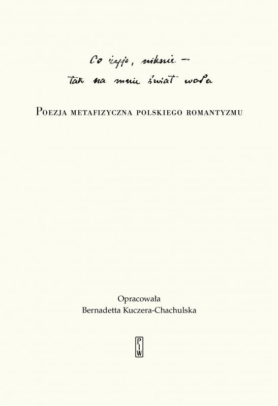 „Co żyje – niknie, tak na mnie świat woła” Bernadetty Kuczery-Chachulskiej to autorski wybór wierszy czterech najważniejszych poetów polskiego romantyzmu: Adama Mickiewicza, Juliusza Słowackiego, Zygmunta Krasińskiego i Cypriana Norwida. Tom został uzupełniony o oryginalne studium interpretacyjne. Według badaczki metafizyczna myśl w sztuce słowa polskiego romantyzmu stała się możliwa dzięki formalnej rewolucji języka poetyckiego, która dokonała się w XIX wieku. Dynamika zmian społecznych oraz rozwój nowych sposobów artystycznego wyrażania nałożyły się na siebie, tworząc szczególny splot. Książka Kuczery-Chachulskiej stanowi wyjątkową próbę odczytania metafizycznego wymiaru poezji romantycznej.