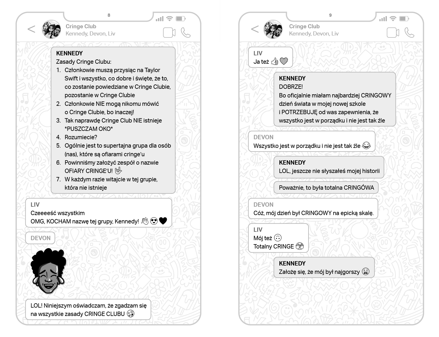 Mam na imię Kennedy King i zostałam ZMUSZONA przez mamę do przeprowadzki do Londynu. Właśnie zaczęłam naukę w Hellington High School (znanej również jako PIEKIELNA SZKOŁA). Jedyną DOBRĄ rzeczą w tej przeprowadzce jest to, że mama w końcu zgodziła się, żebym miała własny telefon (prezent z poczucia winy), dzięki czemu mogę utrzymywać kontakt z najlepszymi przyjaciółmi. Właśnie założyliśmy tajny klub. Nazywa się Cringe Club, ponieważ - jak pewnie się domyślasz - zawiera epicką dawkę cringe'u. Wchodzisz tu na własne ryzyko. I pamiętaj to, co dzieje się w Klubie, ZOSTAJE w Klubie...