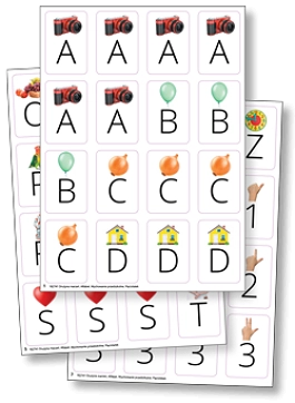 Zestaw kartoników z literami i obrazkami, których nazwy rozpoczynają się daną głoską, a także z liczbami przedstawionymi za pomocą palców dłoni i cyfr.