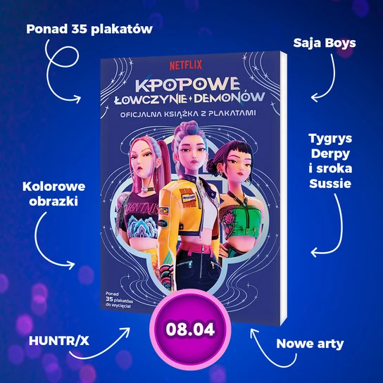 Ekskluzywna książka z plakatami pełna wspaniałych ilustracji! Znajdziesz tu znany na całym świecie zespół HUNTR/X, ale też Saja Boys, tygrysa Derpy’ego i srokę Sussie. Fani w każdym wieku mogą ozdobić swój pokój kolorowymi kolekcjonerskimi plakatami.