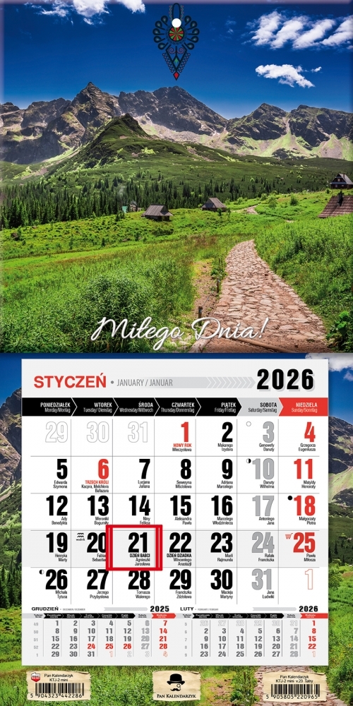 Kalendarz Trójdzielny JEDNODZIELNY MINI Z MAGNESEM. Format 230/460mm. Układ kalendariów jednodzielny z przesuwnym okienkiem. Główka z otworem wierconym oraz magnesem to doskonała propozycja do przyczepienia na lodówkę. Dodatkowo nazwy miesiąca i dni tygodnia w języku Ukraińskim, Angielskim i Niemieckim. Kalendarium dodatkowo zawiera fazy księżyca i znaki zodiaku. Dużo miejsca do notowania, czytelne duże litery i cyfry.