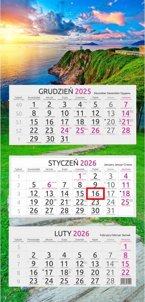 czterojęzyczne kalendarium (PL, GB, D, RUS) z numeracją tygodni i imieninami, bieżący miesiąc wyróżniony kolorystycznie