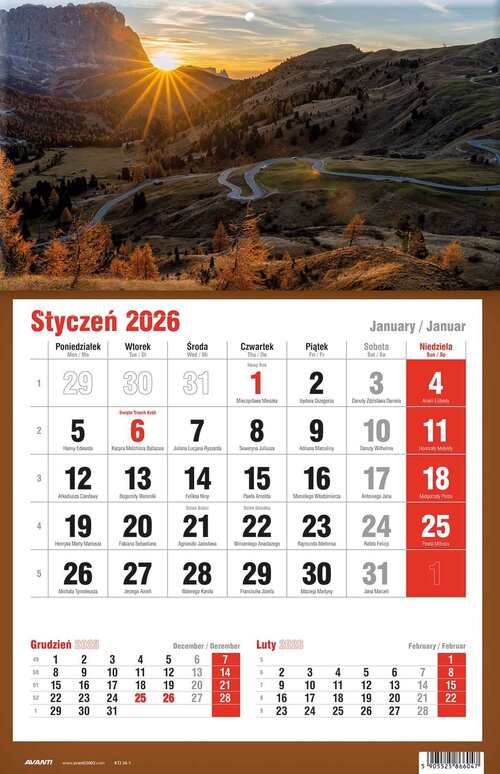 Kalendarz Jednodzielny pasuje wszędzie tam, gdzie na trójdzielny brakuje miejsca, a zależy nam na podglądzie poprzedniego i następnego miesiąca. Kalendaria zawierają oznaczenia miesięcy i dni tygodnia w trzech językach (PL, EN, DE) oraz imieniny i typowe święta.