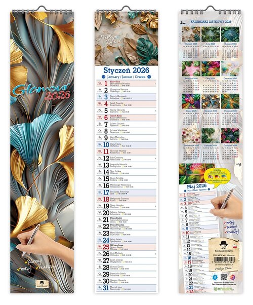 Kalendarz 2026 ŚCIENNY PASKOWY WĄSKI drukowany jednostronnie. Format 106/470mm 12 kart + 2 okładki. Oprawa spirala z zawieszką. Duże czytelne kalendarium z miejscem na notatki . KALENDARZ DO NOTOWANIA I PLANOWANIA KAŻDEGO DNIA. Dodatkowo nazwy miesiąca i dni tygodnia w języku Ukraińskim, Angielskim i Niemieckim. Kalendarium zawiera imieniny,nazwy Świąt, czasy wschodów i zachodów Słońca oraz fazy Księżyca. DODATKOWO ZAWIERA KALENDARZ LISTKOWY DO WYCIĘCIA.