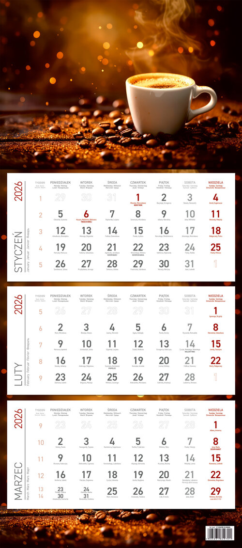 Kalendarz 2026 ścienny trójdzielny Kawa