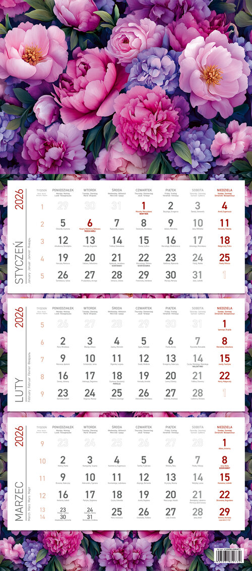 Kalendarz 2026 ścienny trójdzielny Kwiaty