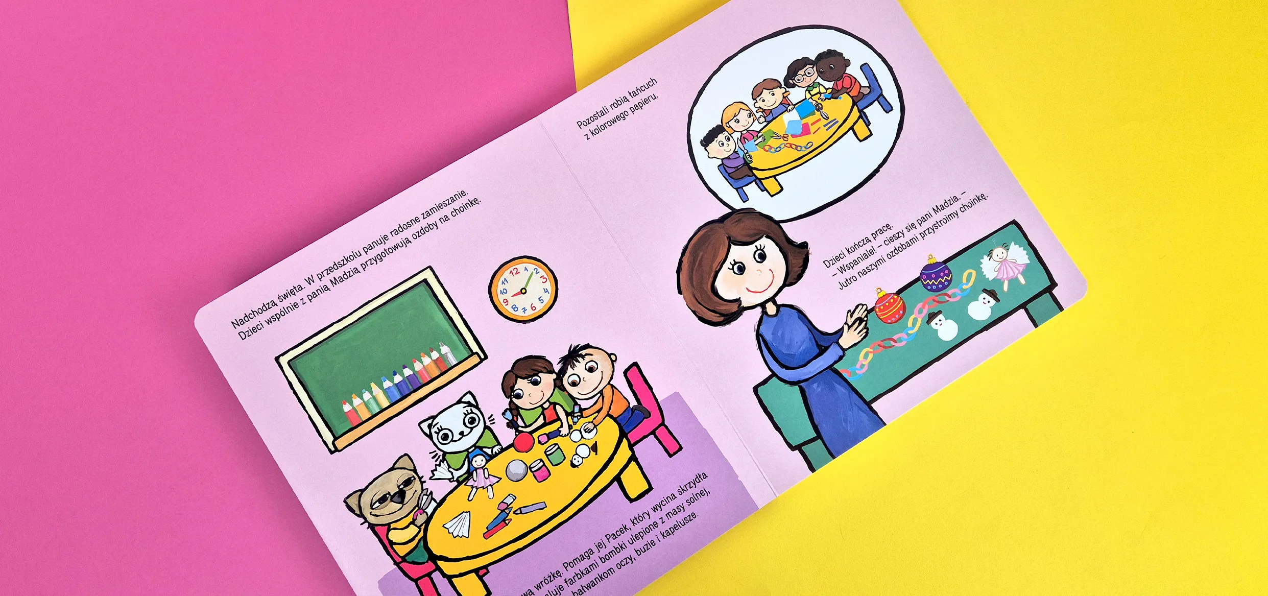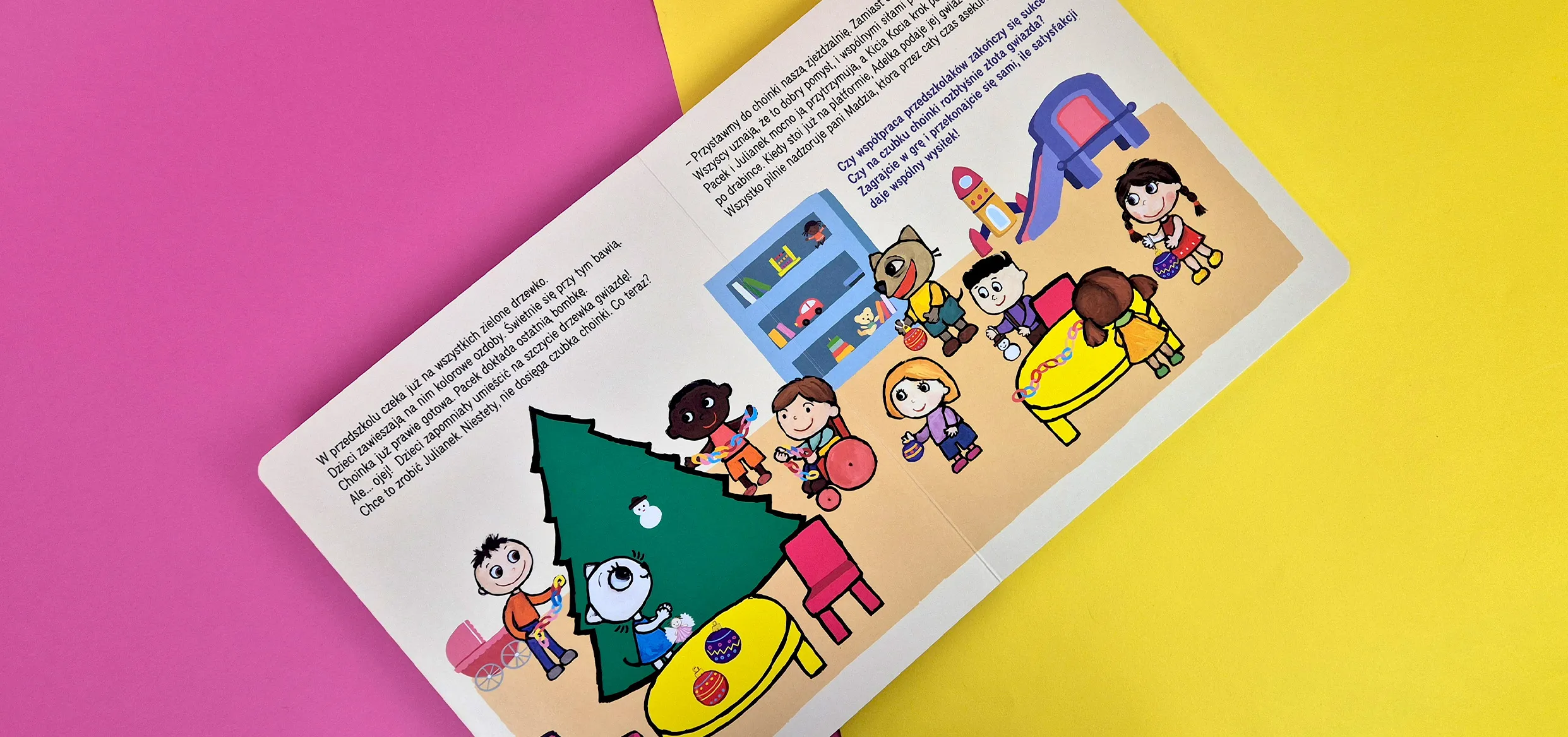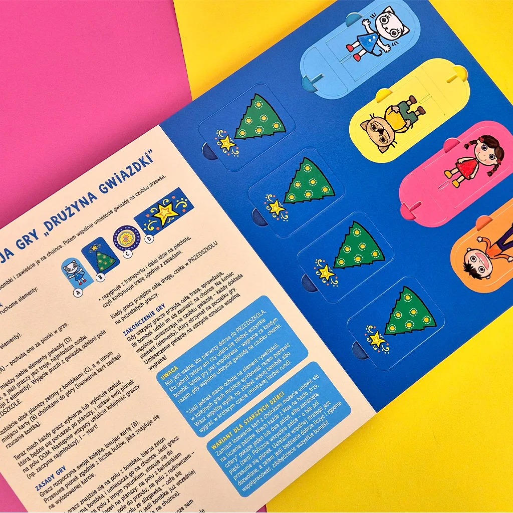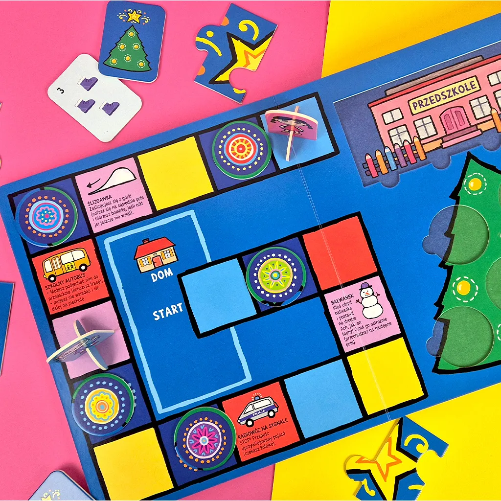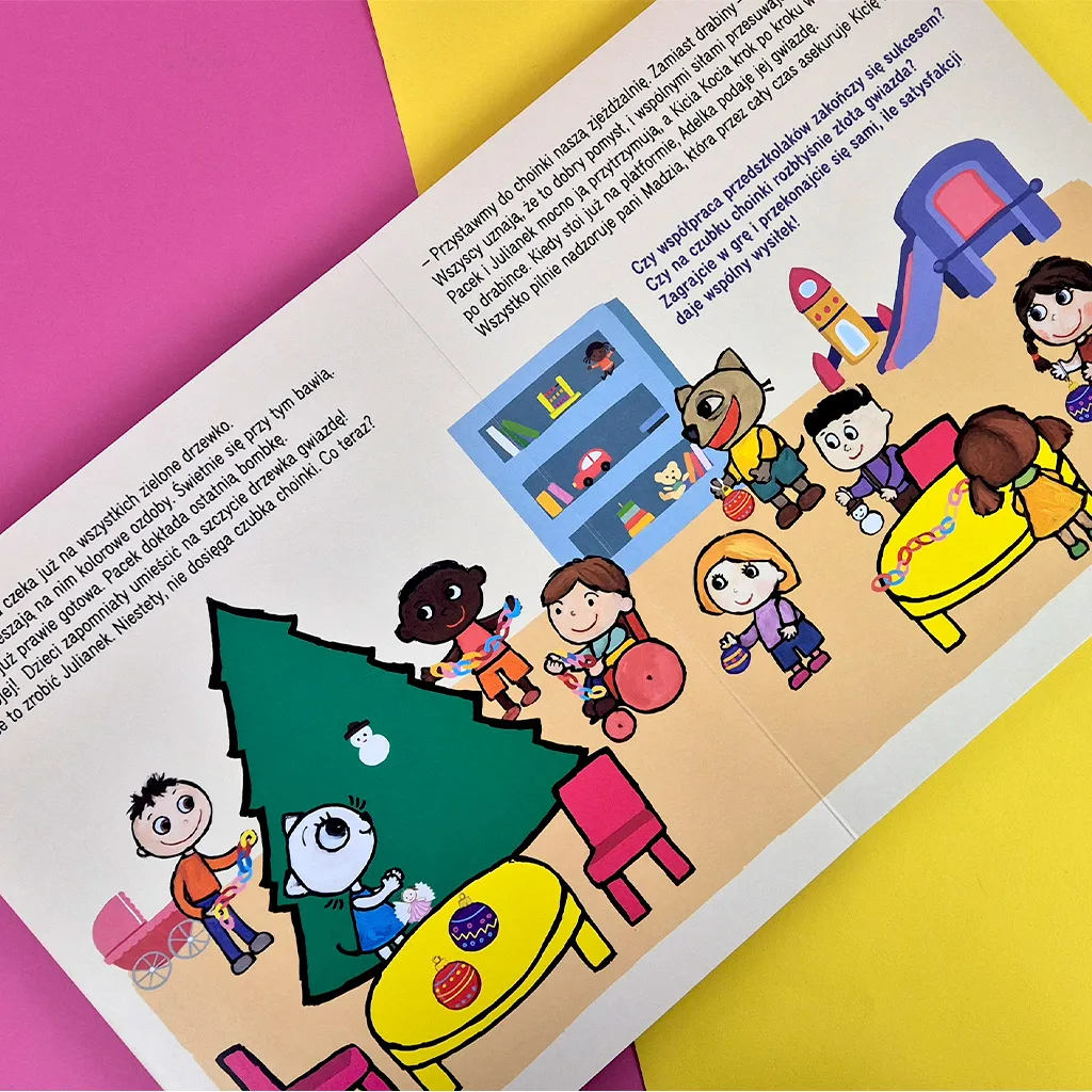 Kicia Kocia i pozostałe przedszkolaki maja do wykonania bardzo ważne zadanie – ubieranie choinki. Dzieci zgodnie współpracują, żeby przygotować piękne ozdoby. Ale jak umieszcza gwiazdę na czubku, skoro choinka jest taka wysoka? Świątecznej historyjce towarzyszy gra, która stanowi idealne wprowadzenie do świata planszówek. Rozgrywka jest krótka, a zasady proste. Gra nie wywołuje nadmiernej frustracji i nie prowokuje do niezdrowej rywalizacji. Zachęca do współpracy i koncentracji. Dzieci ćwiczą spostrzegawczość, liczenie, małą motorykę i myślenie strategiczne.