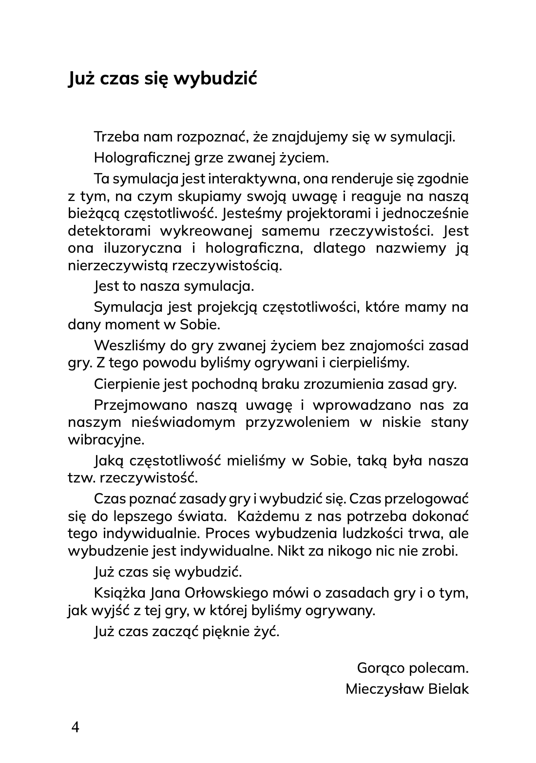 Czas poznać zasady gry i wybudzić się. Czas przelogować się do lepszego świata. Każdemu z nas potrzeba dokonać tego indywidualnie. Proces wybudzenia ludzkości trwa, ale wybudzenie jest indywidualne. Nikt za nikogo nic nie zrobi. Już czas się wybudzić. Książka Jana Orłowskiego mówi o zasadach gry i o tym, jak wyjść z tej gry, w której byliśmy ogrywany. Już czas zacząć pięknie żyć.”