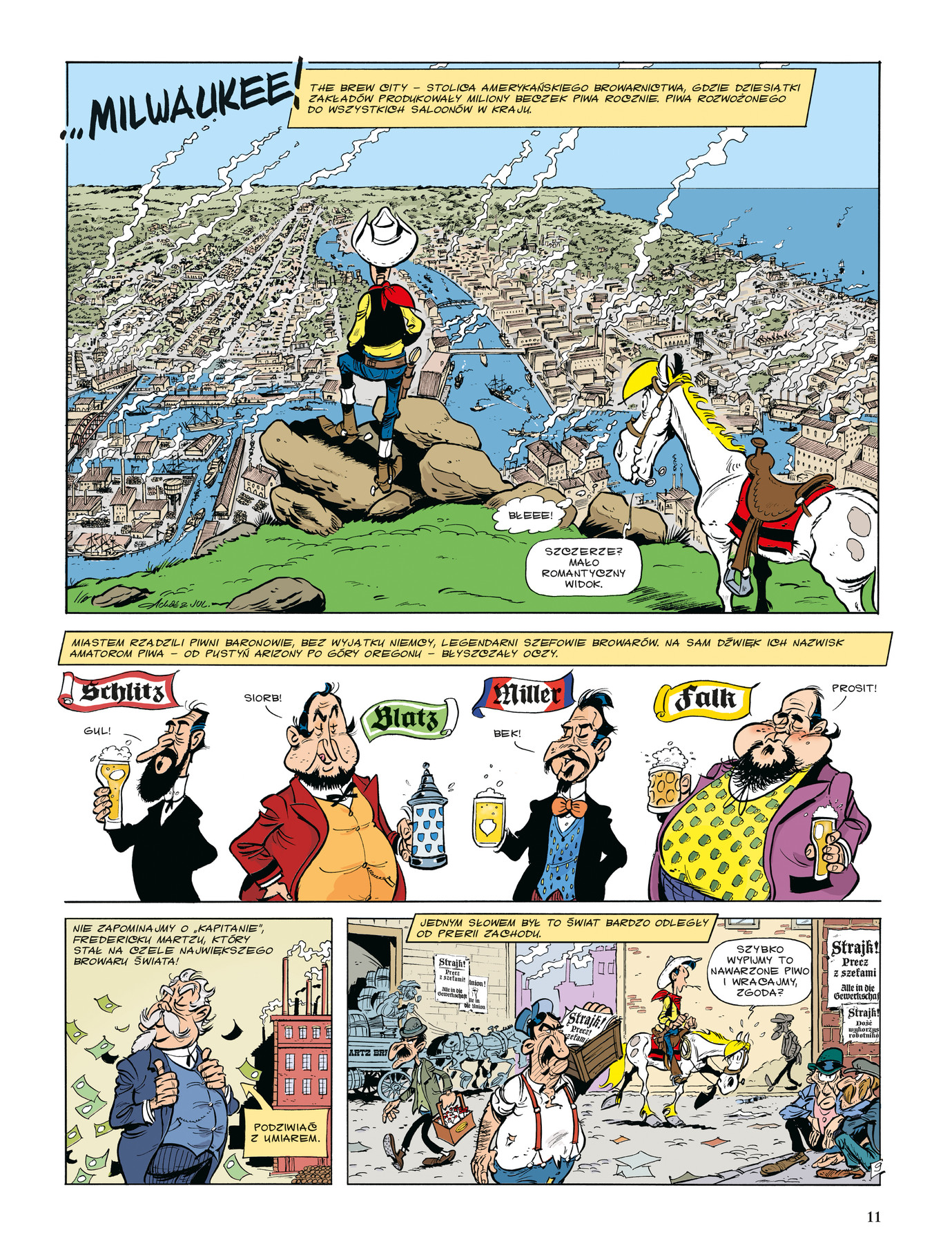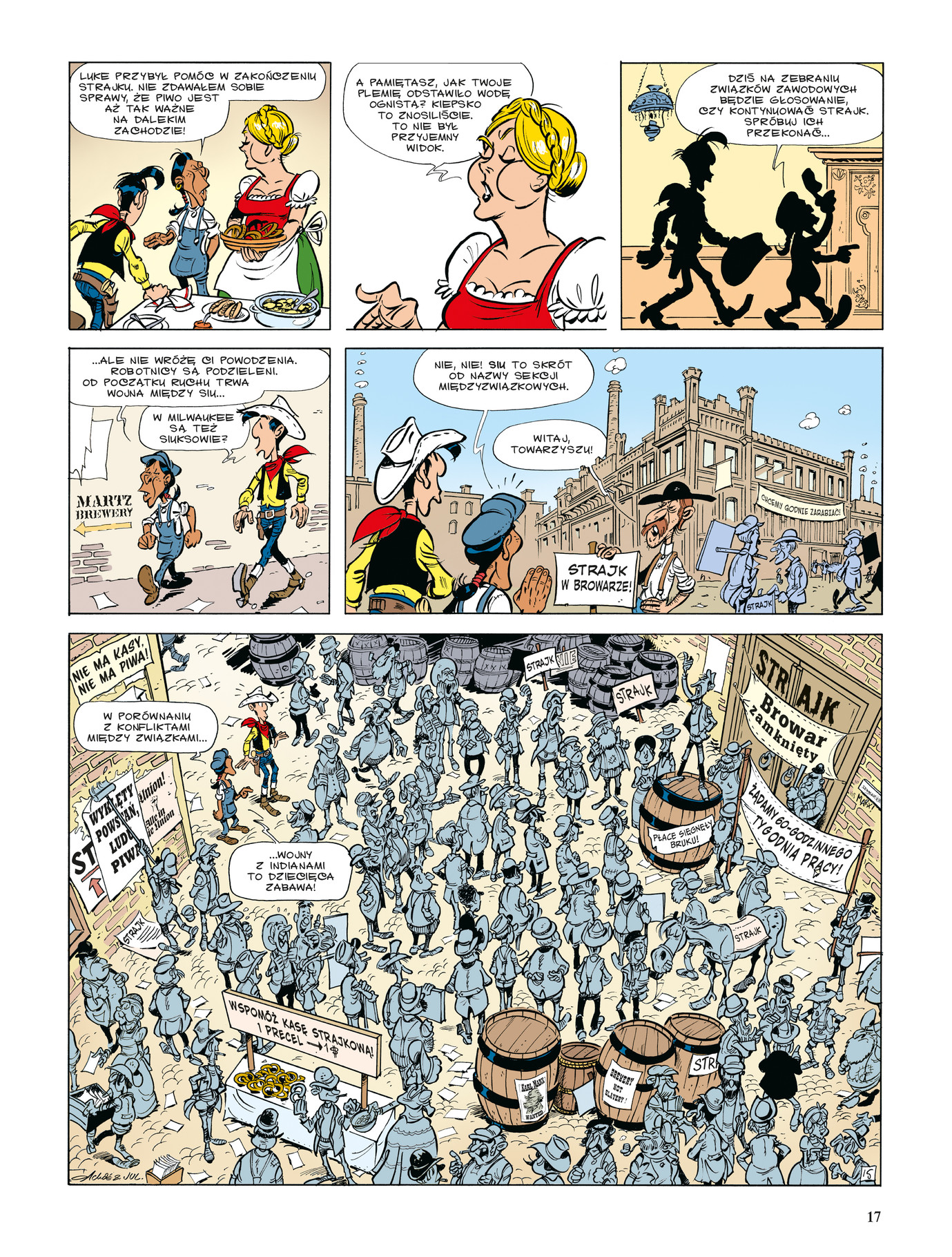 Najsławniejszy komiksowy kowboj znowu w akcji, ale tym razem nie na prerii, a w wielkomiejskiej dżungli. Dziki Zachód przeżywa potężny kryzys, bo w saloonach zabrakło... piwa! Powodem jest strajk pracowników w amerykańskim centrum browarnictwa, Milwaukee. Lucky Luke zostaje poproszony o zażegnanie sporu między właścicielami zakładów produkujących piwo a robotnikami. Samotny Kowboj po raz pierwszy w życiu podejmuje się tak dziwnego zlecenia, więc czuje dużą presję i nie ma wielkich nadziei na sukces. Przeczucie go nie zawodzi, bo wypełnienie zadania okazuje się trudniejsze niż doprowadzenie do pokoju podczas wojen z Indianami...