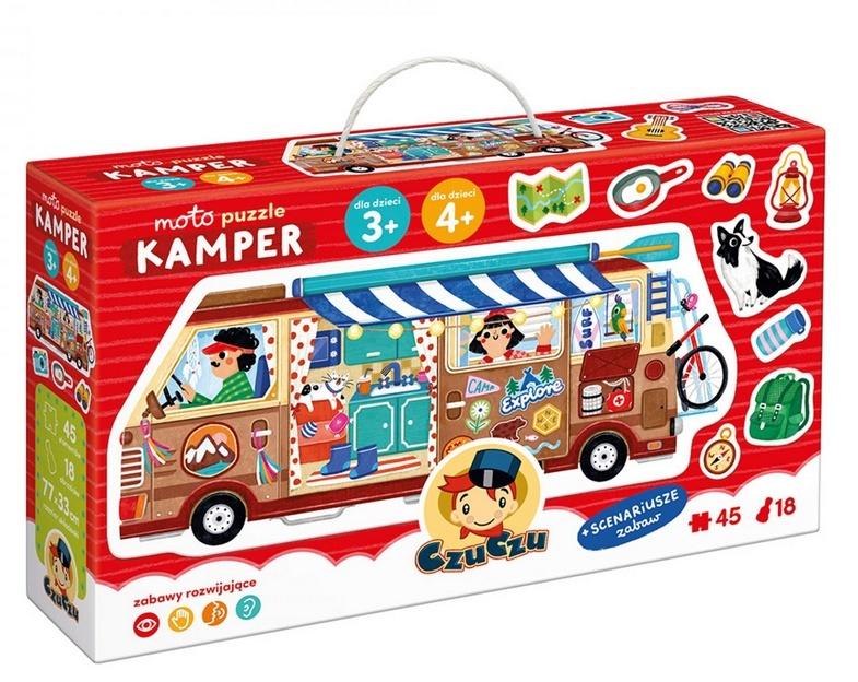 Do pojazdu dołączono 18 dokładanych obrazków, które przedstawiają przydatne na kempingu przedmioty, oraz poradnik z pomysłami na zabawy. Edukacyjny zestaw to doskonały pomysł na mądry prezent dla ciekawego świata przedszkolaka i inspiracja do wielu rozwijających zabaw.