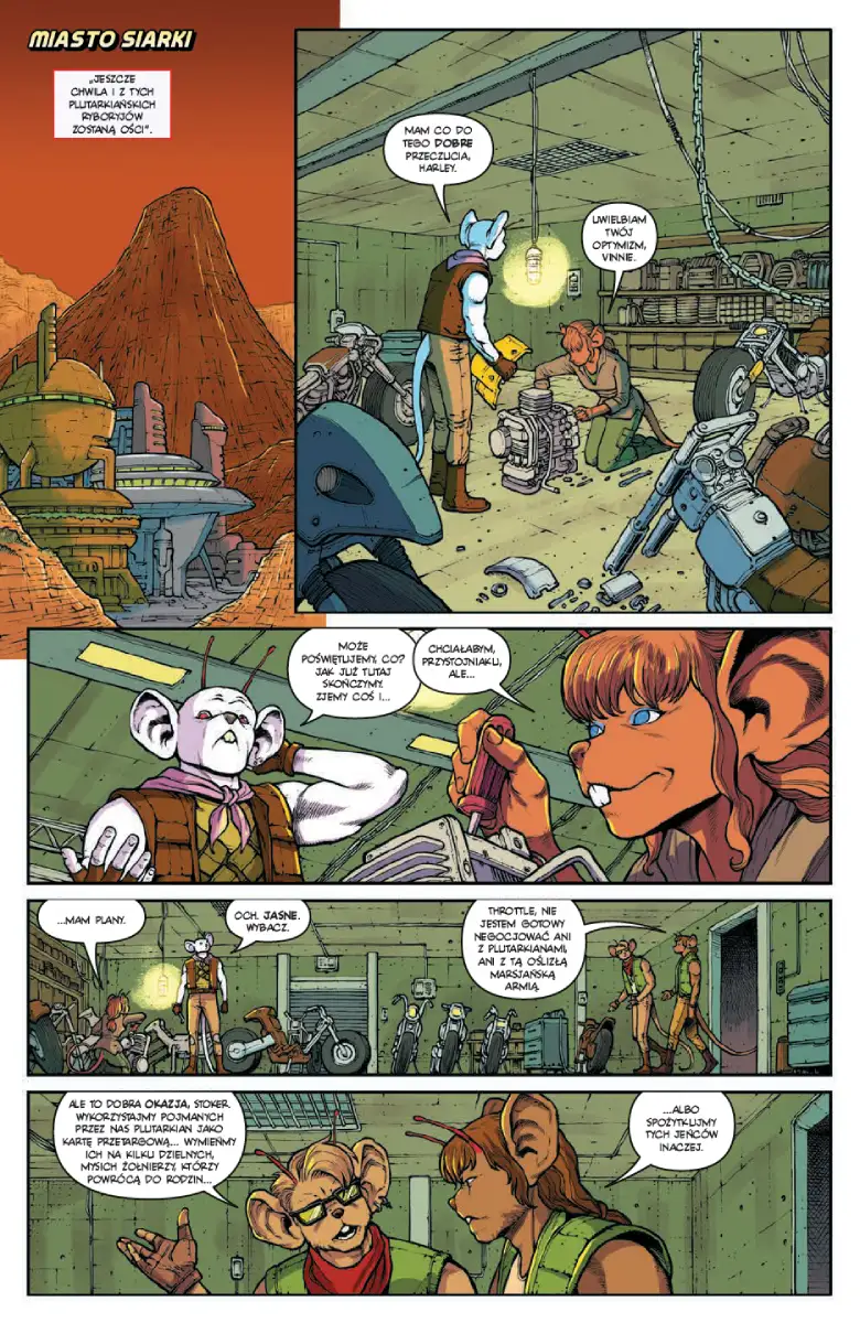 Zadziorni rebelianci – Throttle, Vinnie i Modo – połączyli siły z marsjańskimi Wojownikami Wolności, by stawić czoła bezlitosnej armii plutarkiańskich najeźdźców. Jednak gdy pojawia się nowe, zupełnie nieoczekiwane zagrożenie, Motomyszy stają w obliczu niebezpieczeństwa obejmującego całą galaktykę, wywodzącego się zarówno z Ziemi, jak i z plutarkiańskiego świata! Nie przegap przygód rewolucyjnego tria gryzoni w tej epickiej historii, która wydarzyła się jeszcze przed ich przybyciem na Ziemię!