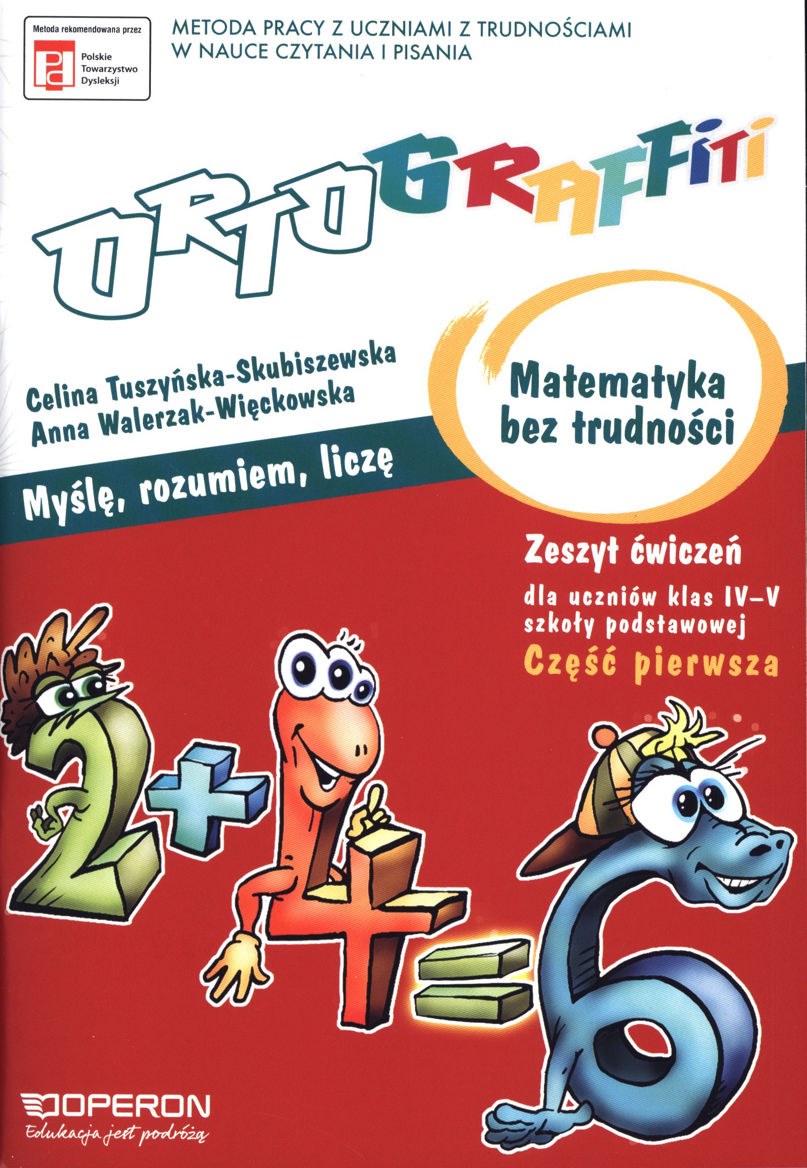 Seria ORTOGRAFFITI dla uczniów z trudnościami w uczeniu się matematyki z klas IV - V szkoły podstawowej składa się z 2 zeszytów.Zeszyty stanowią kompletną całość i w pełni wspomagają rozwój podstawowych umiejętności matematycznych dziecka w szkole podstawowej. Zeszyt pierwszy zawiera zadania ćwiczące umiejętność wykonywania działań na liczbach naturalnych.Materiał podzielony został na bloki tematyczne. Każdy z nich dotyczy innego kontynentu i zawiera ćwiczenia rozwijające różnorodne umiejętności matematyczne. Ćwiczenia zamieszczone w dwóch zeszytah zaplanowano na dwa lata pracy terapeutycznej z uczniem.