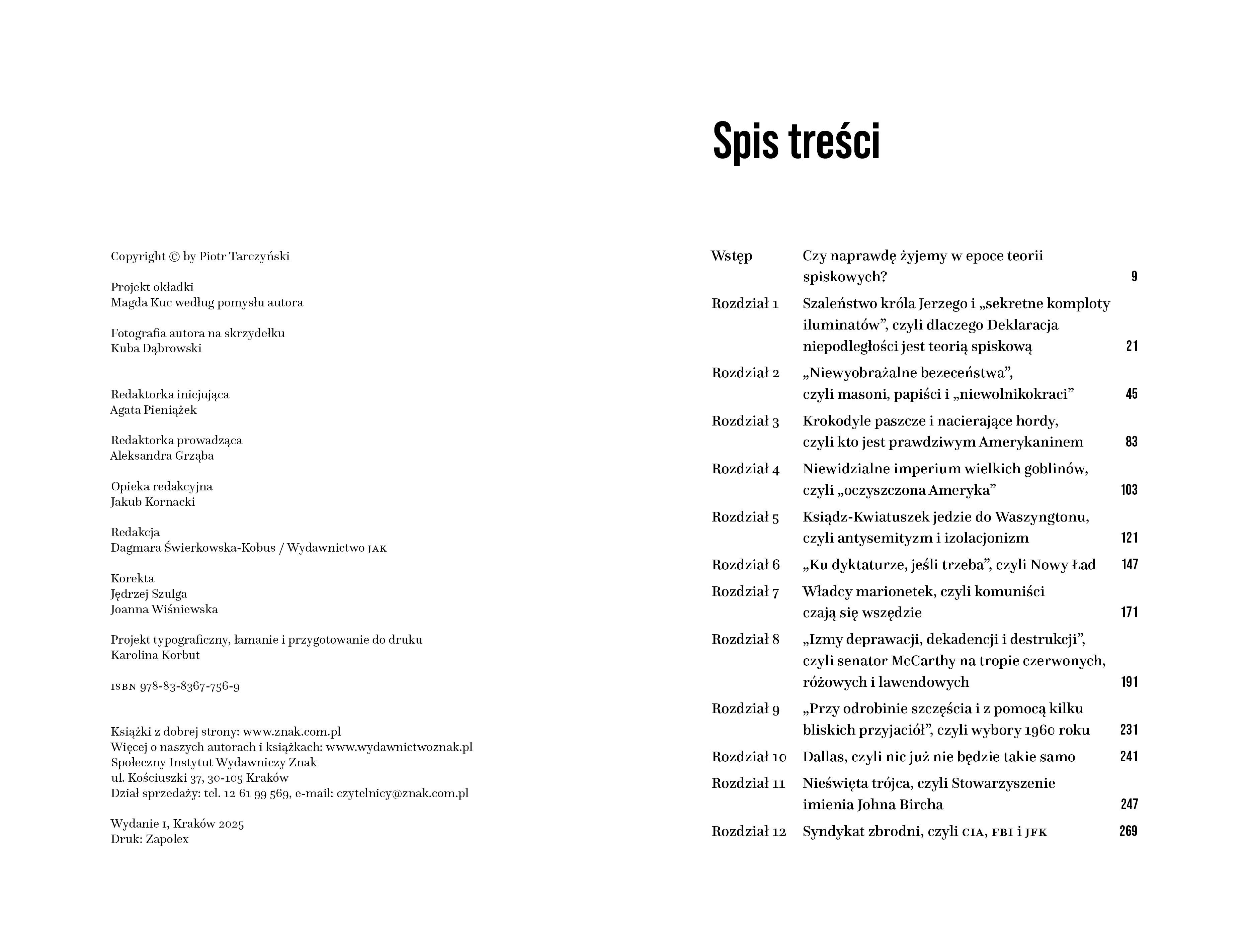 Jedyna w swoim rodzaju, pasjonująca podróż przez historię Stanów Zjednoczonych ukazaną przez pryzmat teorii spiskowych, na których został zbudowany ten kraj. Amerykanista i historyk, współtwórca popularnego i nagradzanego Podkastu amerykańskiego Piotr Tarczyński wnikliwie analizuje bardziej i mniej popularne teorie spiskowe – od Illuminatów, przez Watergate, po QAnon – i pokazuje, jak nierozłącznie związane są z nimi kultura i popkultura. Z erudycją i humorem opowiada o tym, jak przy pomocy nierealnych scenariuszy Amerykanie tłumaczą sobie rzeczywistość.