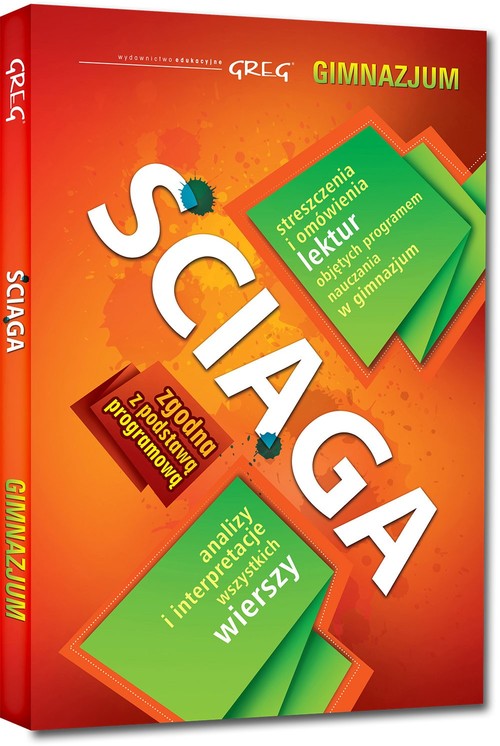Ściąga do gimnazjum to nowość na rynku, będąca odpowiedzią na potrzeby uczniów, którzy chcą mieć w jednym miejscu treści potrzebne na lekcjach języka polskiego we wszystkich trzech klasach. Dzięki niej nie potrzeba już kupować co roku nowej książki. Zawiera całość materiału wymaganego w obowiązującej podstawie programowej.Zamieszczono w niej analizy i interpretacje wszystkich najczęściej omawianych wierszy, a także szczegółowe opracowania lektur oraz omówienia fragmentów Biblii i najpopularniejszych w szkole mitów; całość uzupełniają krótkie notki biograficzne autorów.Najważniejsze terminy ujęto w ramki i wyjaśniono. Książka napisana została przystępnym, zrozumiałym językiem, nie ma w niej niepotrzebnych, ponadprogramowych treści. Będzie doskonałą pomocą przed odpowiedzią, sprawdzianem i egzaminem.Gorąco polecamy!