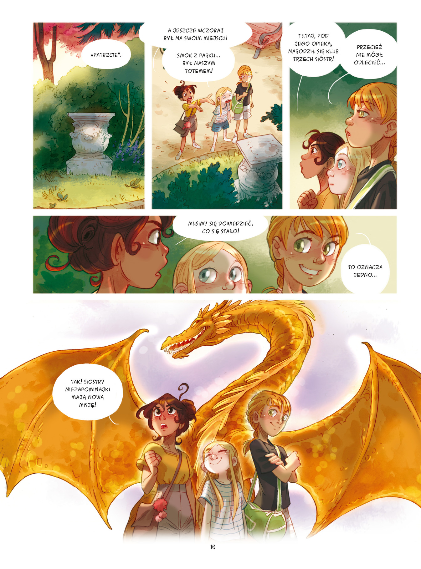 Najnowszy tom mądrej, zaskakującej i wzruszającej opowieści o trzech siostrach Niezapominajkach. Dziewczynki są bardzo zajęte. Sara gra w turnieju sportowym, Kasjopeja pisze opowiadanie na konkurs, a Lucilla pomaga w schronisku dla zwierząt. I właśnie wtedy orientują się, że z miejskiego parku zniknęła rzeźba smoka, którą uznawały za totem swojego Klubu Trzech Sióstr! Kto ją ukradł? Rozpoczynają śledztwo, które doprowadzi je do ciekawych wniosków na temat tak ważnych spraw jak ambicja, osiąganie celu i przyjaźń. Może też uda im się uratować dzielnicową księgarnię, a wraz z nią prawdziwą magię słów?