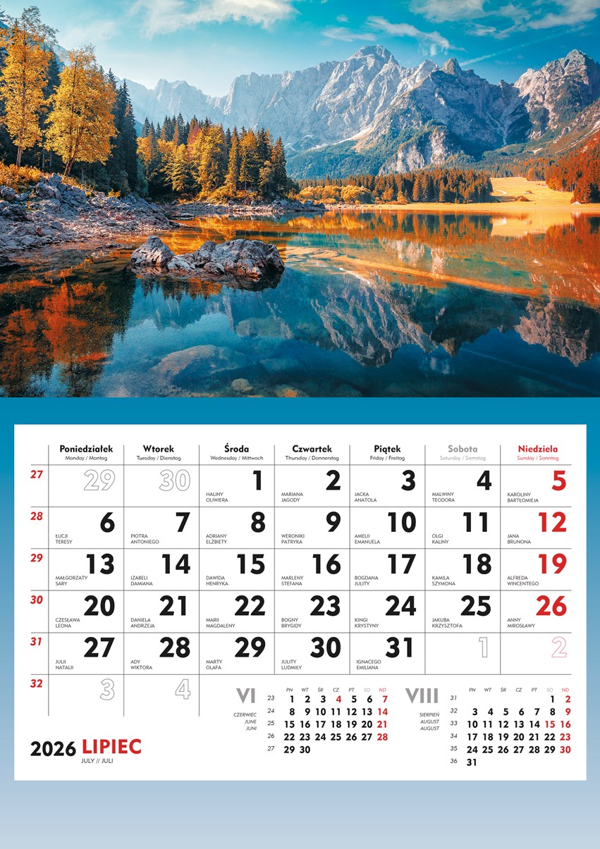 Główka pełnokolorowa, okienko przesuwane, nazwy miesięcy i tygodni w wersjach językowych, miejsce na nadruk reklamowy.