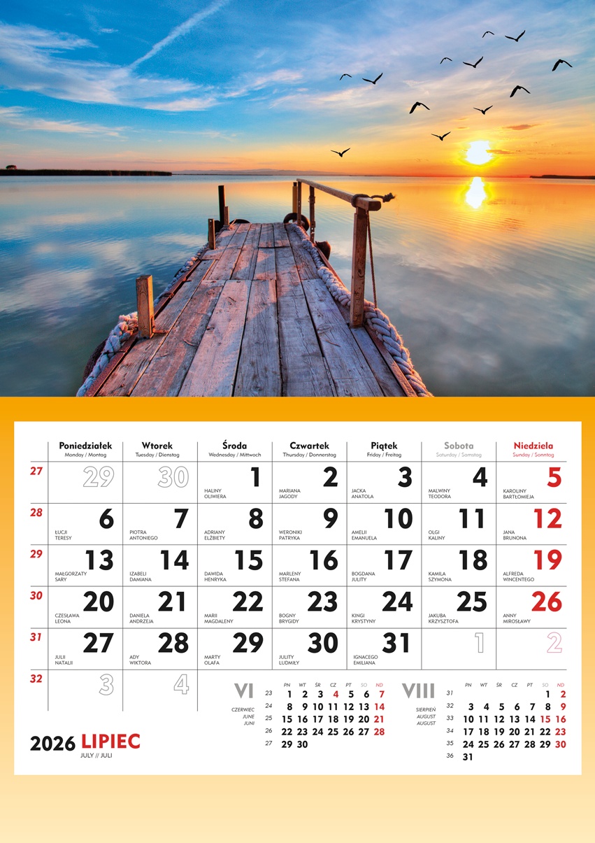 Główka pełnokolorowa, okienko przesuwane, nazwy miesięcy i tygodni w wersjach językowych, miejsce na nadruk reklamowy.