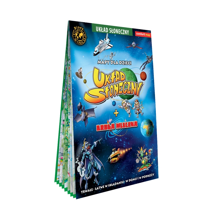 Układ Słoneczny + Droga Mleczna. Mapy dla dzieci to przydatna i niezwykle interesująca publikacja przedstawiająca planety, księżyce, planetoidy, komety, meteoroidy, a także kilkadziesiąt najsłynniejszych statków kosmicznych: rakiet, wahadłowców, sond i sztucznych satelitów. Mapa zawiera tabelę, w której znajdują się informacje o Słońcu, wszystkich planetach Układu Słonecznego oraz jedynym satelicie Ziemi Księżycu. Omówienie planet obejmuje m.in. informacje o ich masie, powierzchni, temperaturze, odległości od Słońca, czasie, w jakim obracają się wokół niego oraz dookoła własnej osi, a także liczbie naturalnych satelitów. Publikacja przedstawia historię ewolucji i eksploracji Układu Słonecznego w sposób ciekawy, a jednocześnie dzięki komiksowym, humorystycznym rysunkom atrakcyjny i lekki. To doskonała propozycja dla młodego astronoma, która w znaczący sposób poszerzy horyzonty wiedzy o najbliższej nam części Wszechświata. Dodatkiem znajdującym się na odwrocie mapy Układu Słonecznego jest mapa Drogi Mlecznej, zawierająca ponad 200 kolorowych ilustracji, które umożliwią czytelnikom poznanie gwiazd, planet oraz zjawisk astronomicznych zachodzących w naszej galaktyce. To świetna propozycja dla starszych dzieci, ponieważ obejmuje szereg bardziej złożonych zagadnień z zakresu astronomii, zawierających elementy fizyki i chemii.