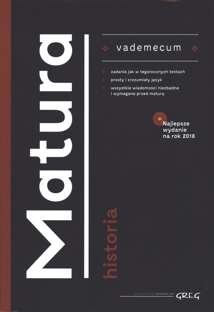Vademecum Matura - historia Wydawnictwa GREG zawiera całość materiału potrzebnego do przygotowania się do matury w jej obecnie obowiązującej formule. Jest zgodne z najnowszą podstawą programową, a treści obejmujące materiał z klasy I dodatkowo oznaczono graficznie.