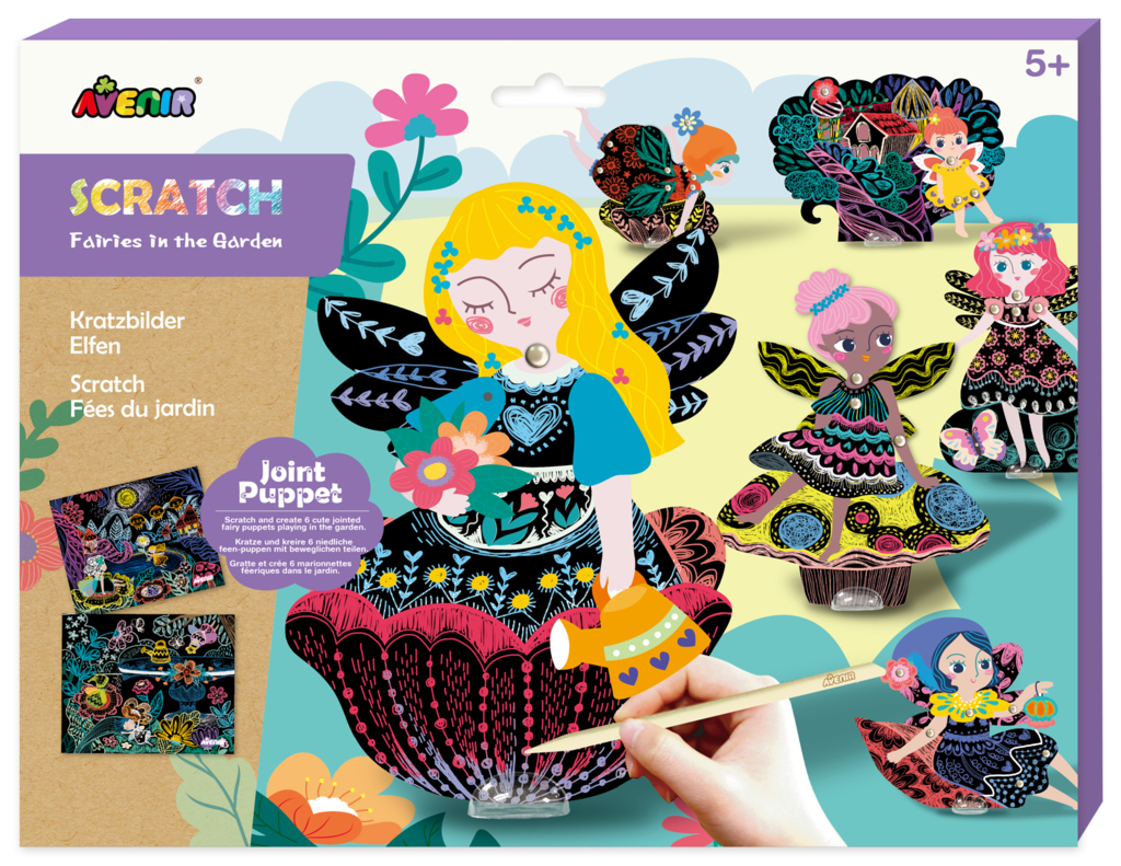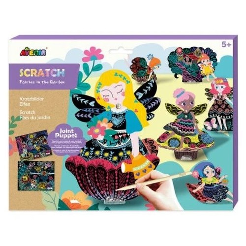 Avenir Scratch to zupełnie nowe podejście do prac ręcznych. Wyjątkowy arkusz, na którym tworzy się poprzez zdrapywanie warstwy wierzchniej, by odsłonić wielobarwną warstwę spodnią. Zestaw Wróżki w Ogrodzie pozwala na stworzenie ruszających się papierowych laleczek, którymi dziewczynka może się bawić.