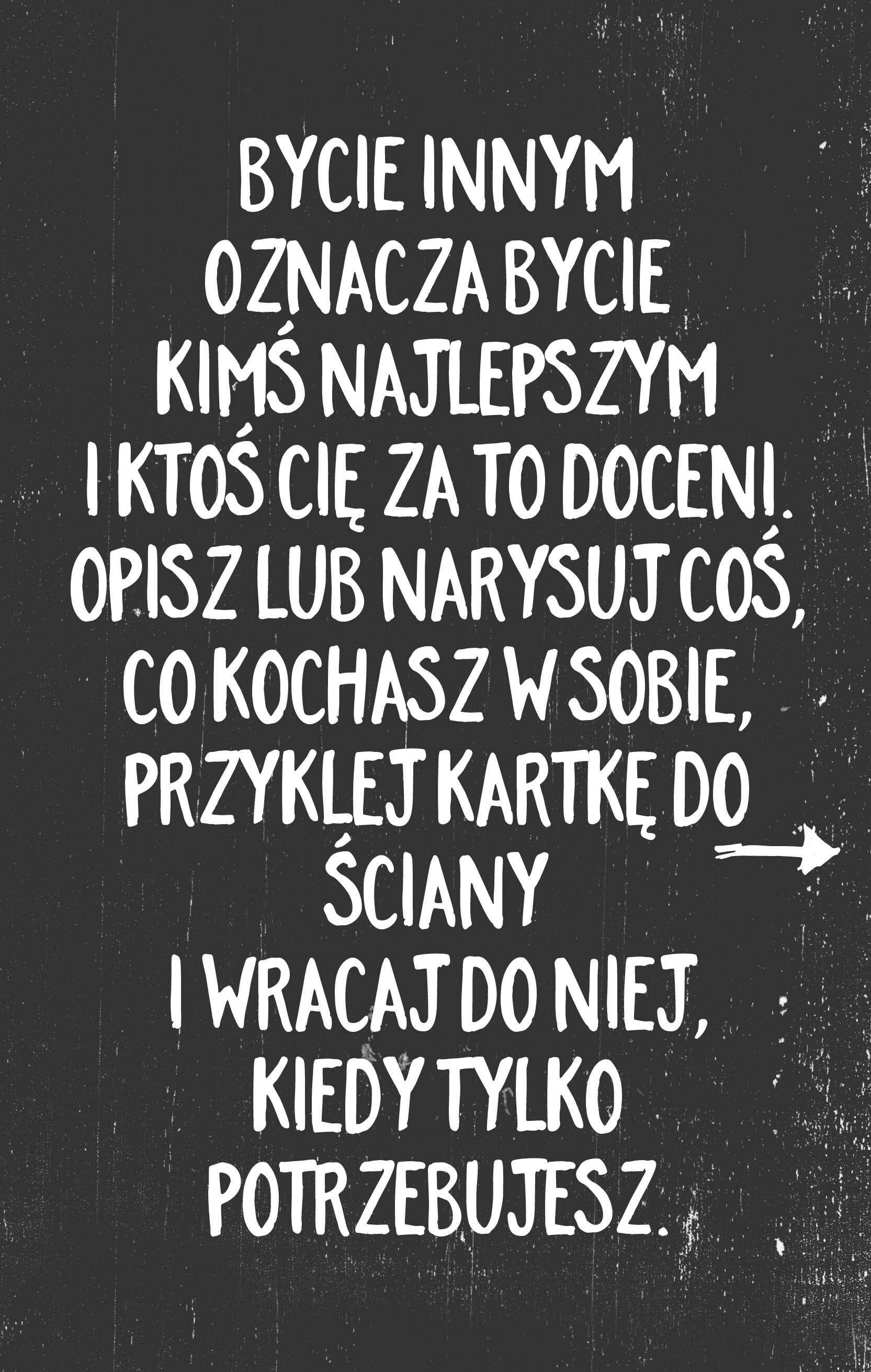 Celem tej książki jest pomóc ci w poszukiwaniu na nie odpowiedzi, wyrażeniu miłości do wszystkiego, co w sobie lubisz, przezwyciężeniu słabości i stawieniu czoła najmroczniejszym lękom. To książka, którą możesz podrzeć, pomazać, spalić, zniszczyć i stworzyć od nowa. Jeśli rozpadnie się na kawałki, to znak, że używasz jej dobrze. Ta książka ma składać się z ciebie.